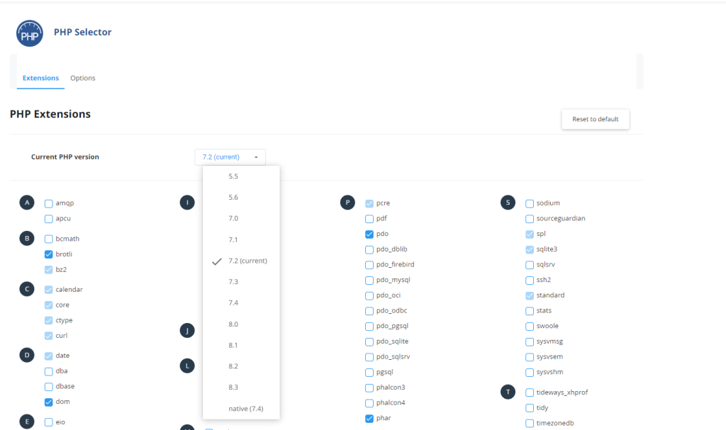 - Choose PHP Version: In the PHP Version Manager interface, you’ll see a list of available PHP versions. Select the version you want to use from the drop-down menu. You can typically choose from various PHP versions, including PHP 5.x, PHP 7.x, PHP 8.x, etc. Note that the specific versions available may vary depending on your hosting provider’s configuration.